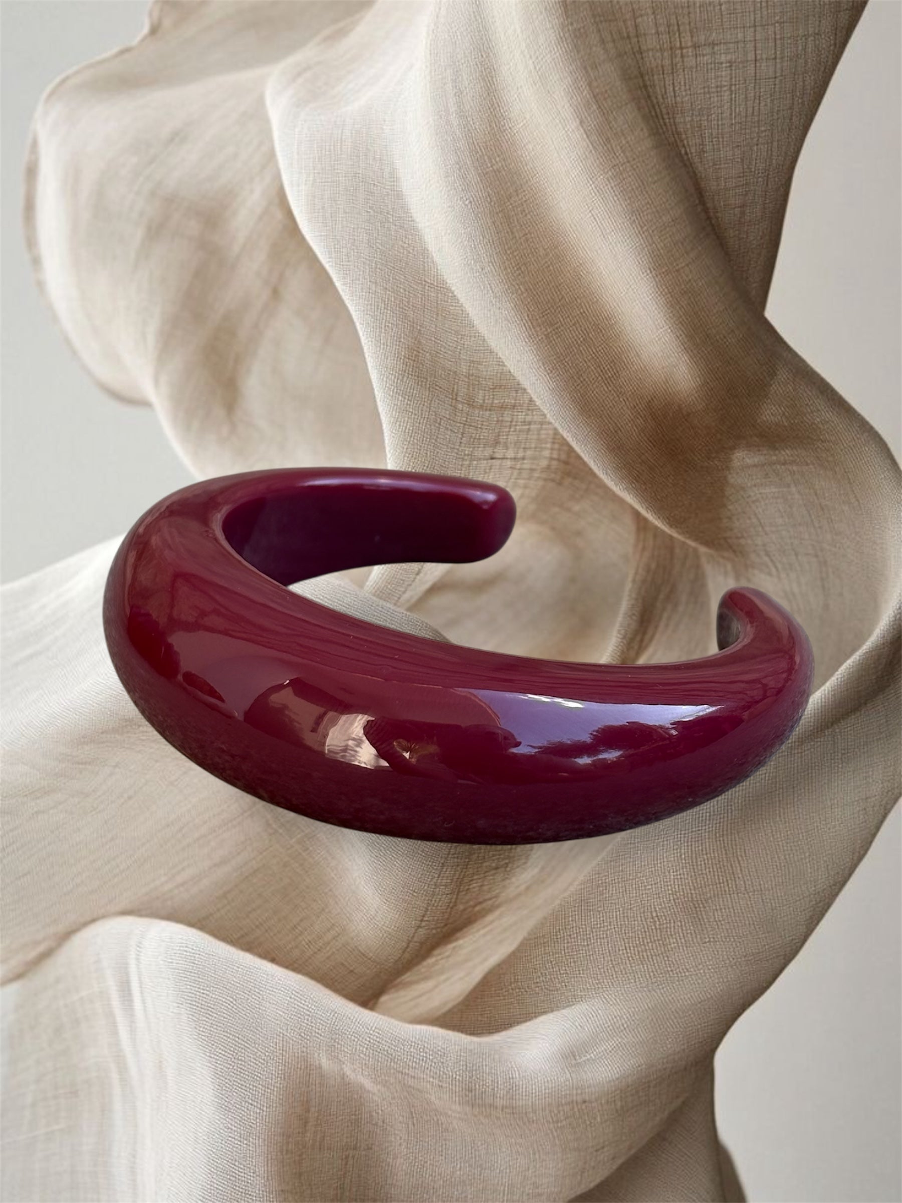 Ένα minimal βραχιόλι από ακρυλικό σε βαθύ βουργουνδί χρώμα, με στρογγυλεμένο, μαλακό σχήμα. Λεπτό και urban, δίνει κομψότητα και χαρακτήρα σε κάθε εμφάνιση.