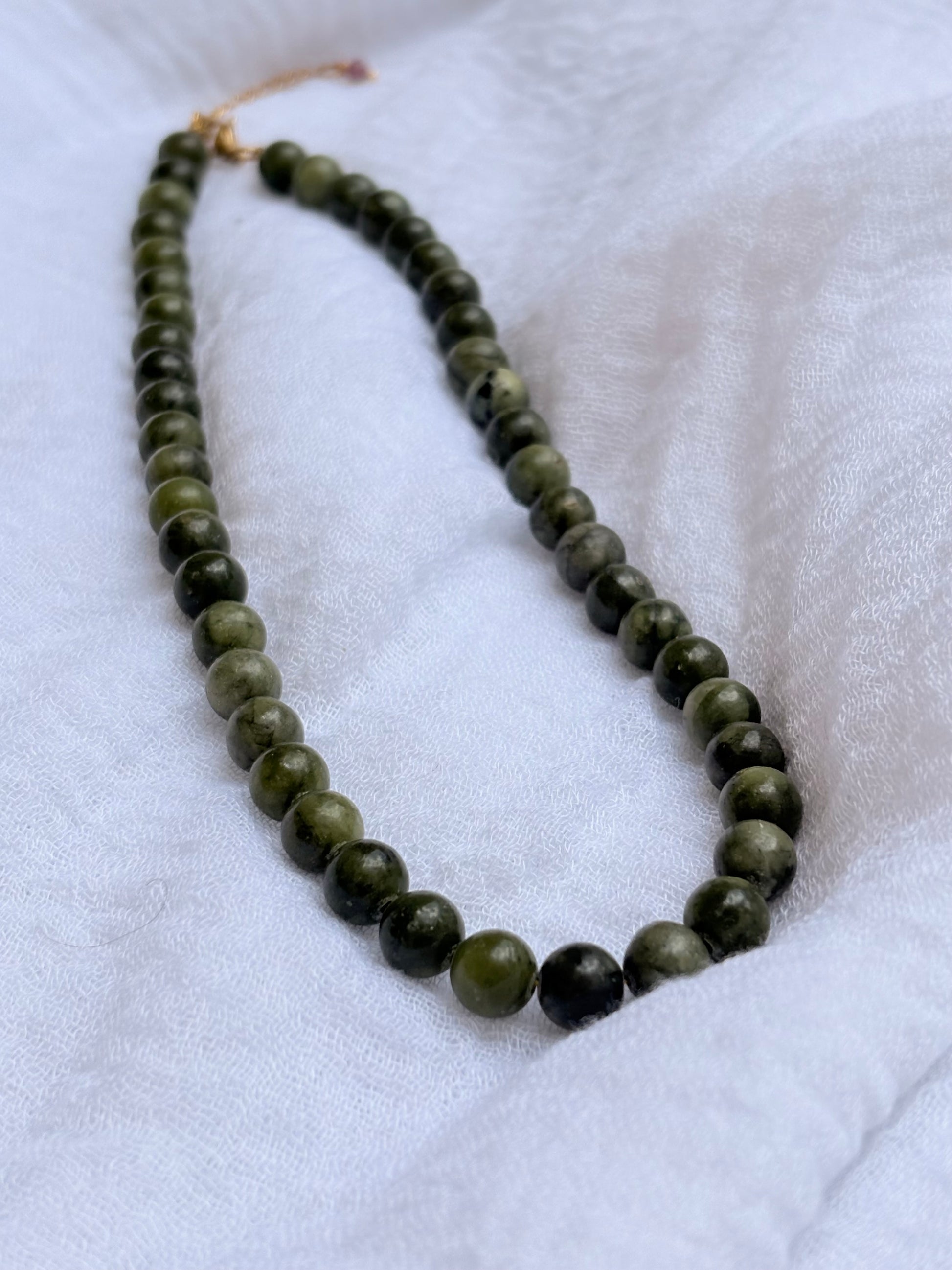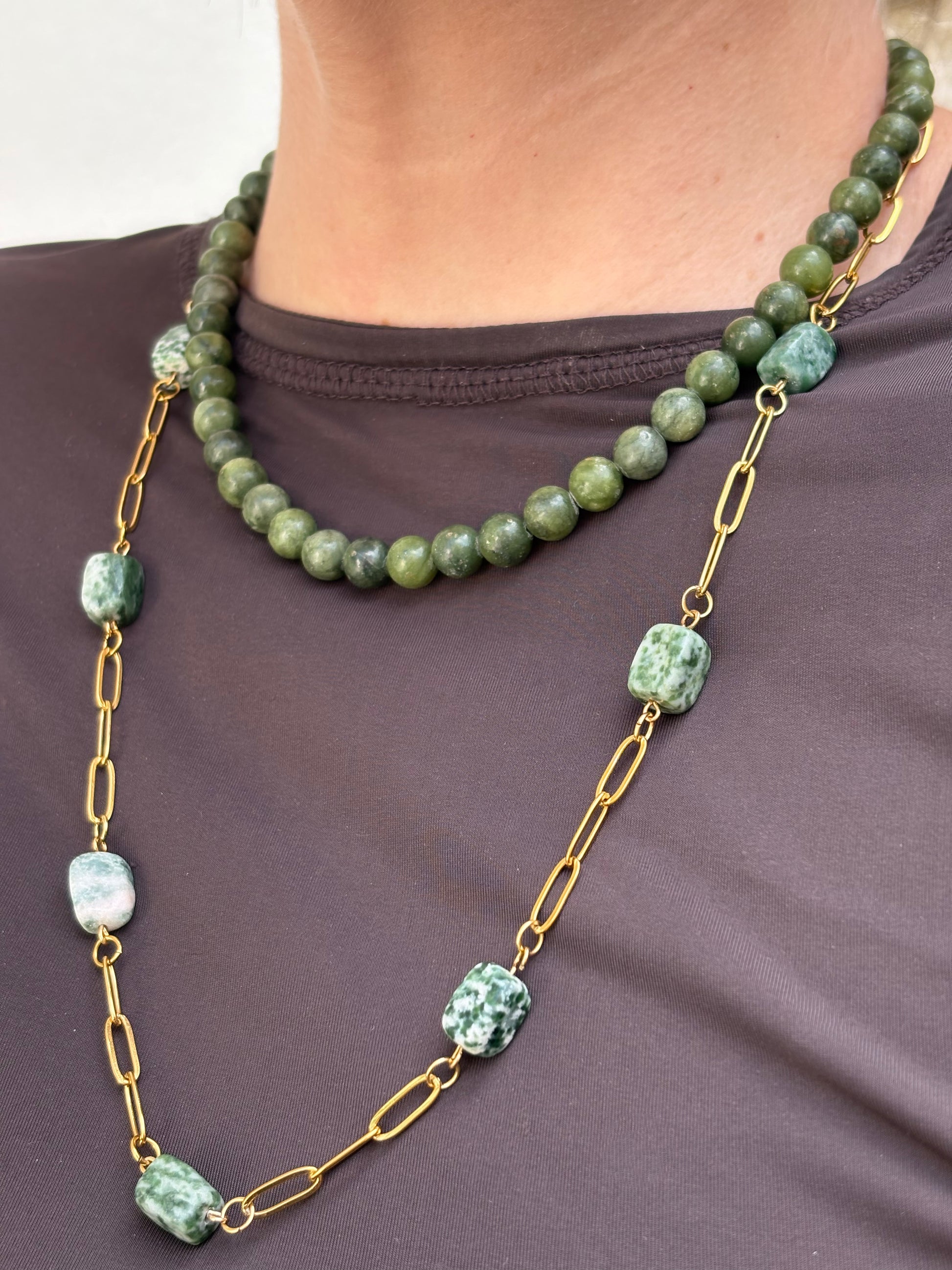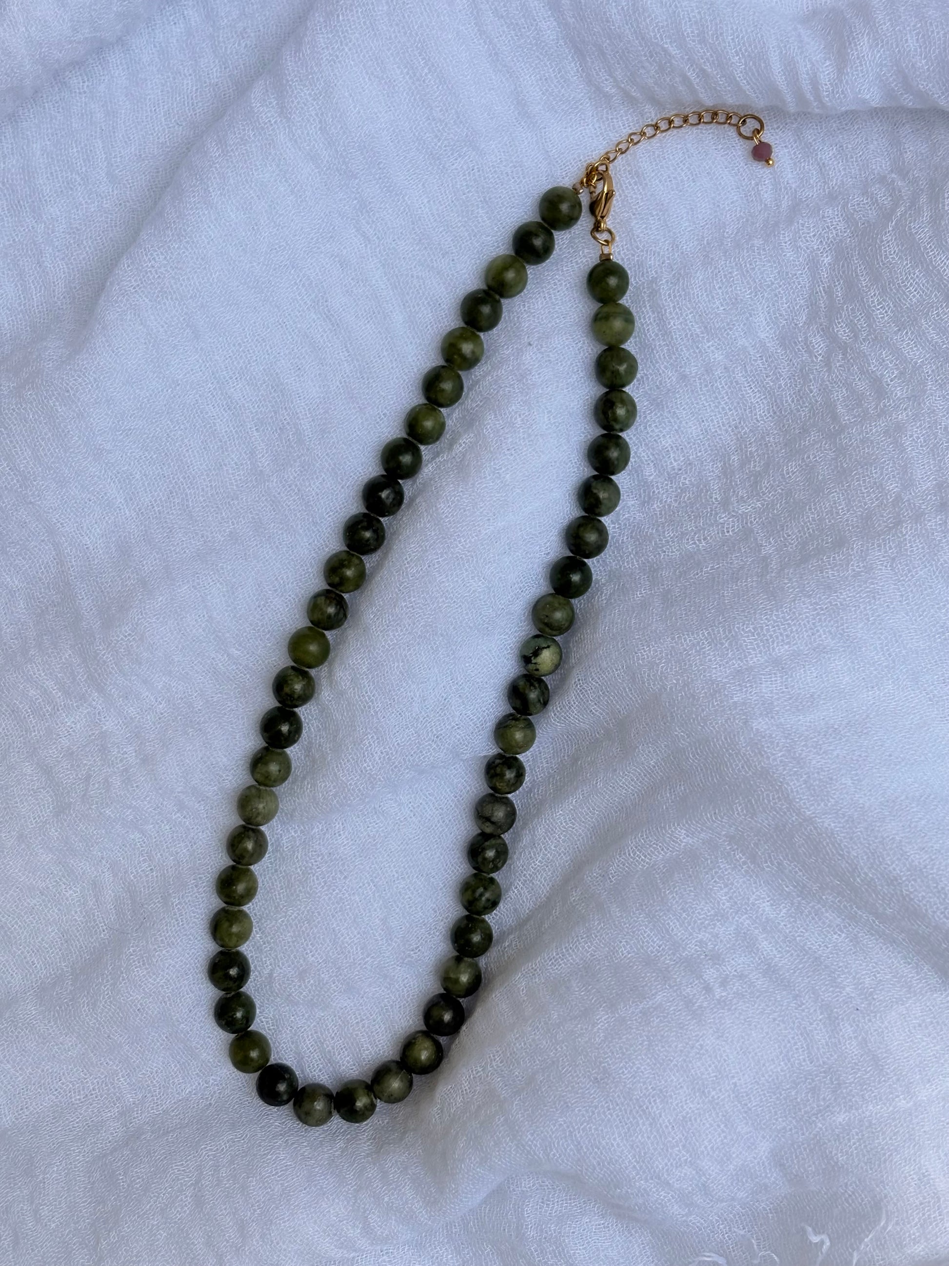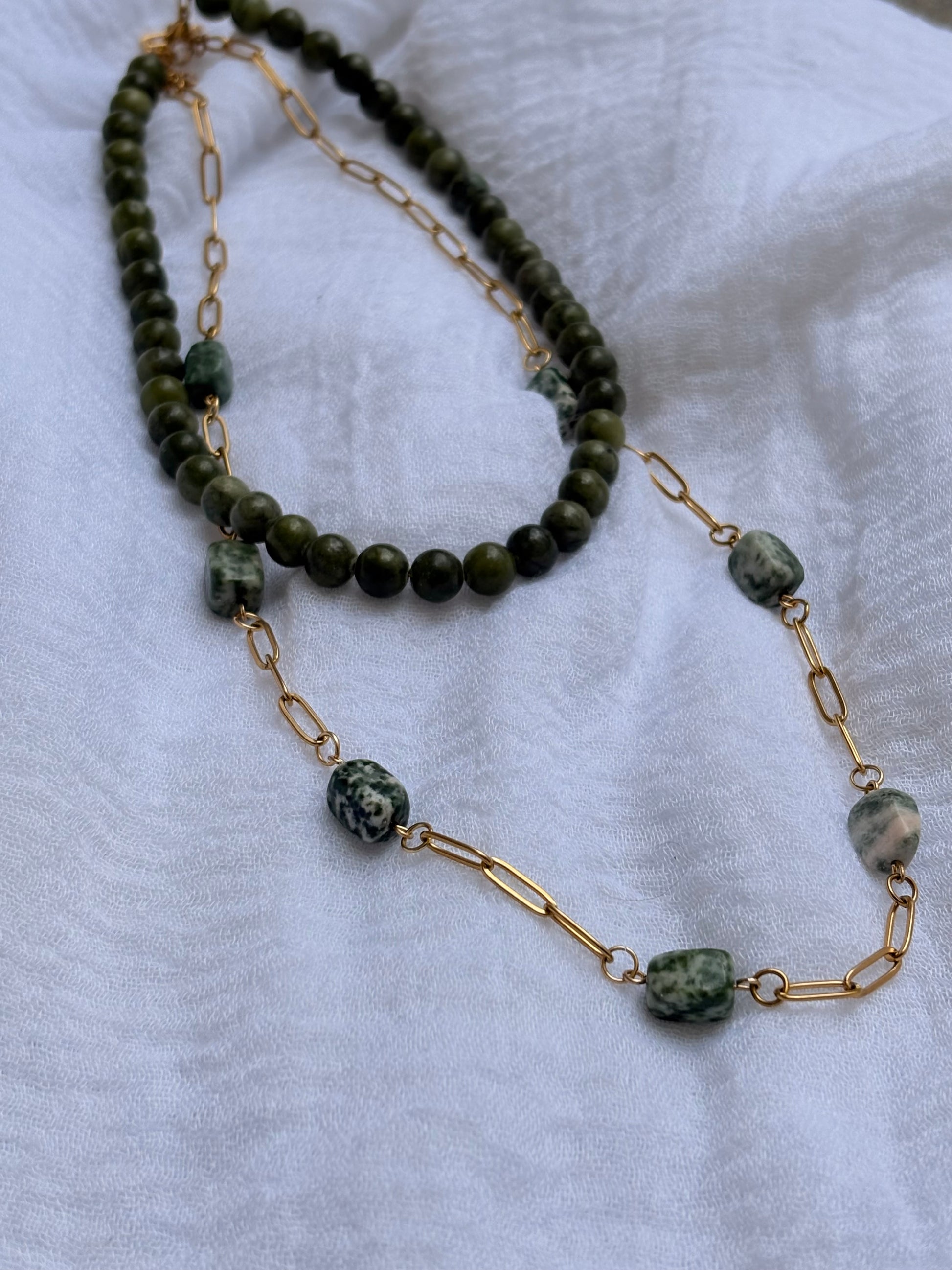 Χειροποίητο κολιέ από φυσική πράσινη πέτρα σε βαθιά, γήινη απόχρωση. Εμπνευσμένο από τη γαλήνη του δάσους, αποπνέει κομψότητα και αρμονία με τη φύση. Κουμπώματα από ανοξείδωτο ατσάλι για αντοχή στον χρόνο.