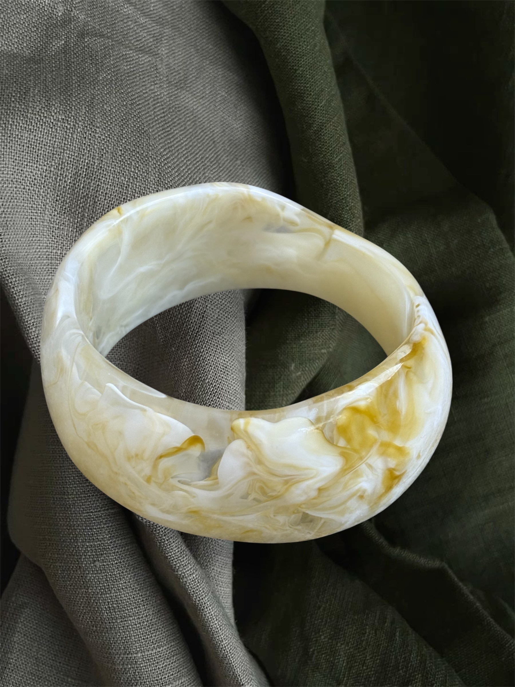 Βραχιόλι από ακρυλικό σε ζεστές, κρεμ-καραμελέ αποχρώσεις με στρογγυλεμένο, μαλακό σχήμα. Minimal και cozy, προσθέτει μία γλυκιά πινελιά σε κάθε look!