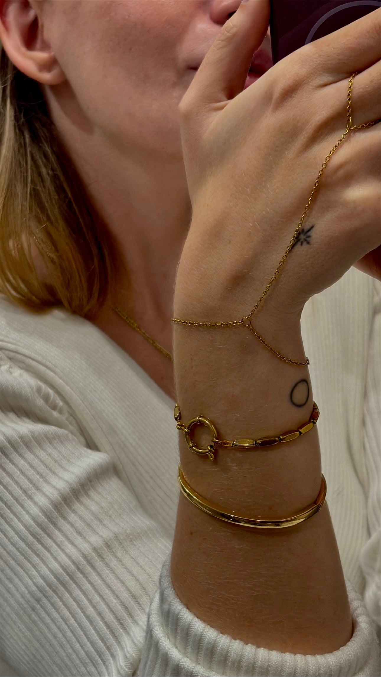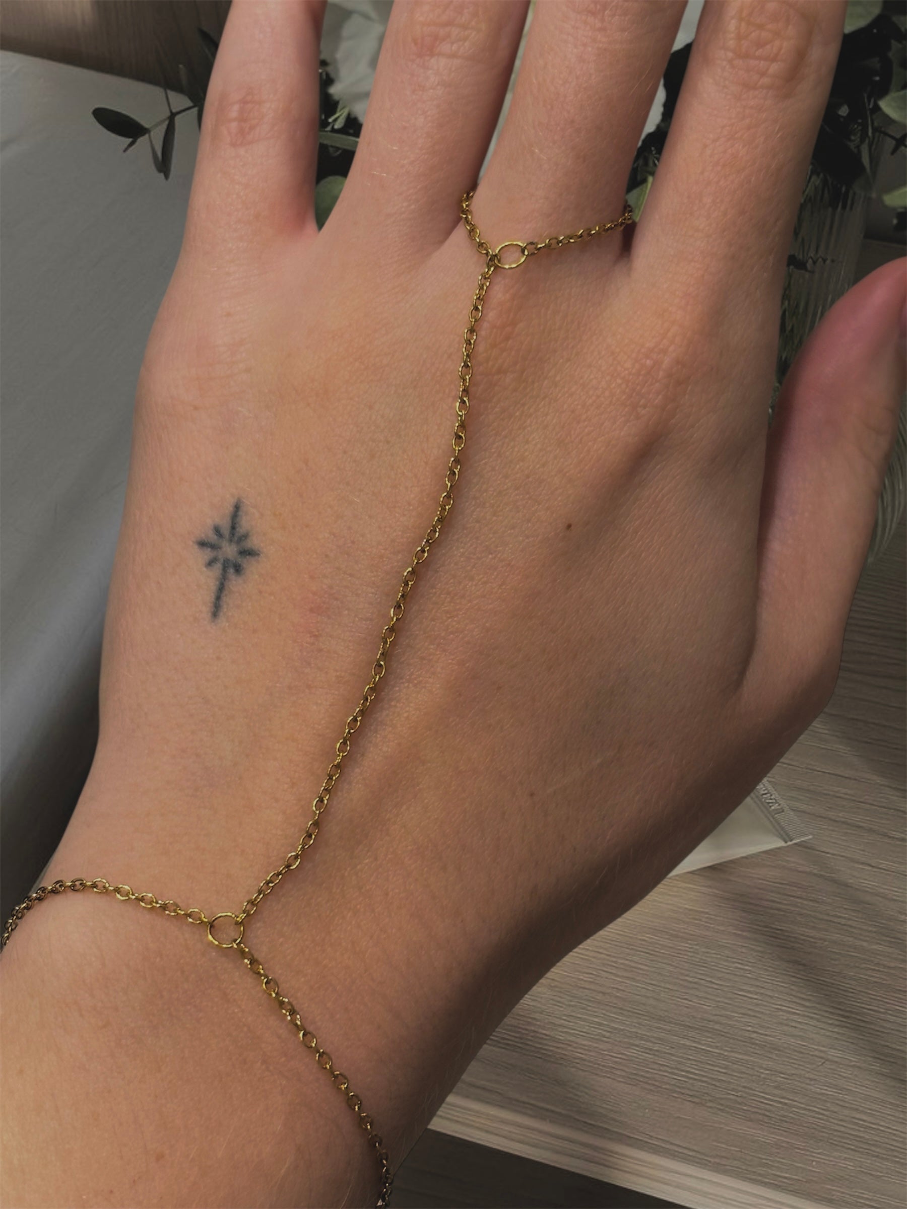 Χειροποίητο hand chain από επιχρυσωμένη αλυσίδα που αγκαλιάζει απαλά το χέρι και συνδέεται με το δάχτυλο.